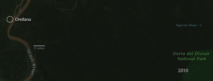 Women washing large pots greeted us as we walked by. Carlos, our guide, had suggested we stop there to see the post and to visit Isla Baños, a small community that is located 3 km inland along a road built by a Pucallpa logging company that runs the post. People from Isla Baños told us the road extends about 100 km to the east, where the company was logging. According to them, trucks hauled out logs, day and night, and the volume of timber at the site pointed to much activity. Although dusty, the road was in perfect condition, an investment indicative of the value of the resource being extracted. The road was not quite as long as people suggested, but it can easily be spotted on Google Earth, reaching eastwards almost halfway to the Tapiche River. What is most striking from the satellite imagery is how quickly the road has advanced, knowing that all valuable timber species are being stripped out (Figure 12). The Sierra del Divisor National Park lies only a few kilometers further east.