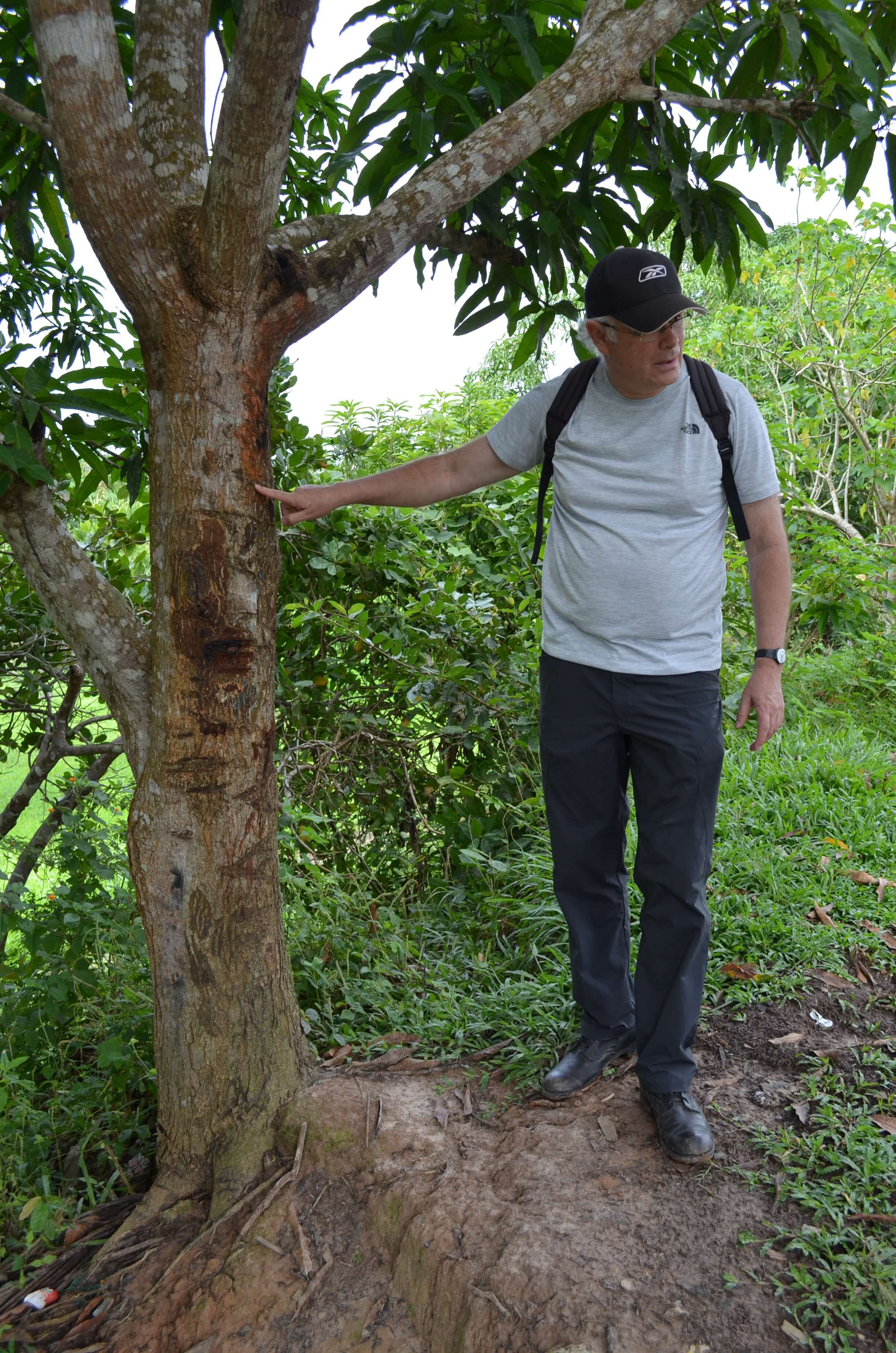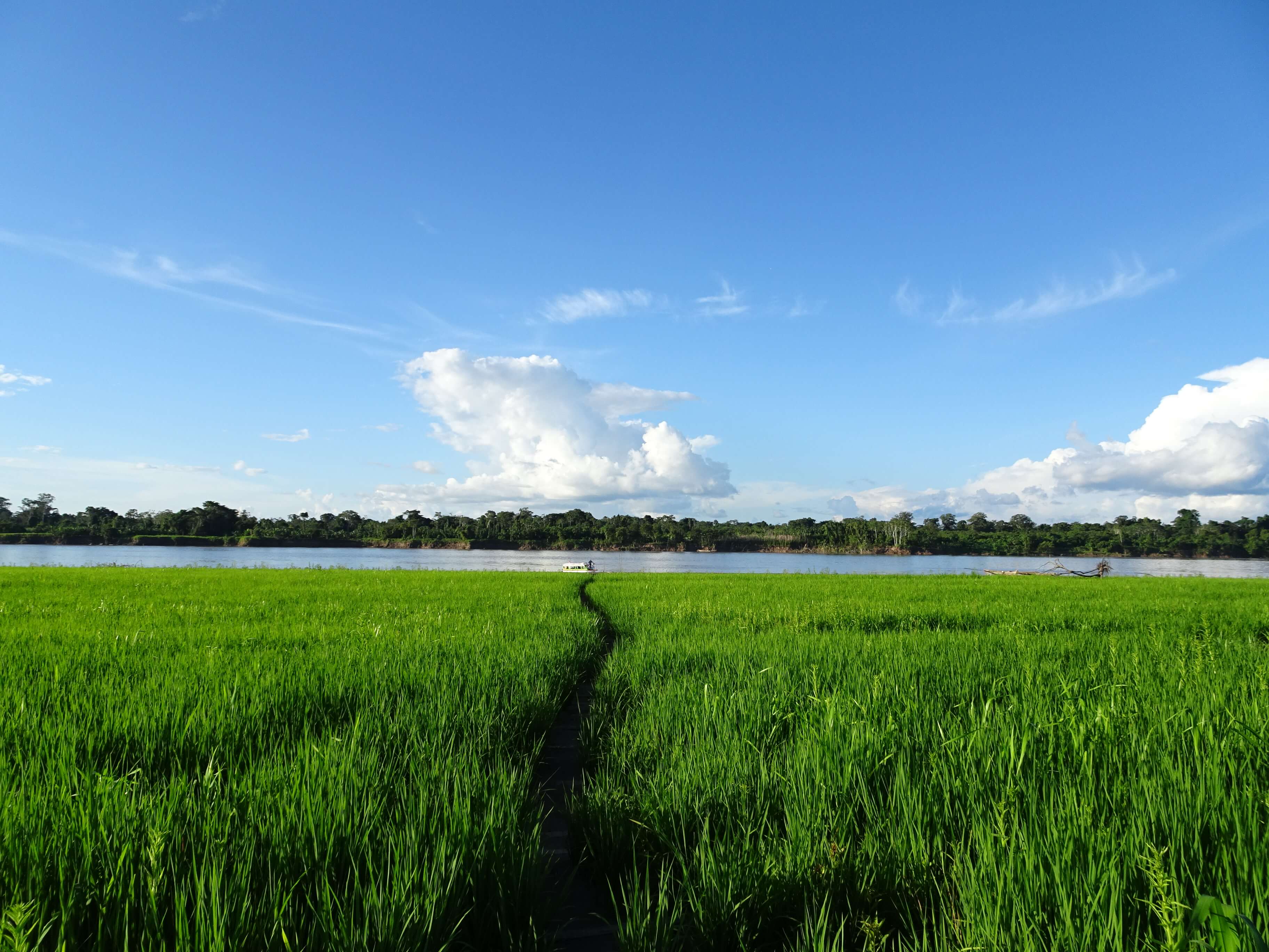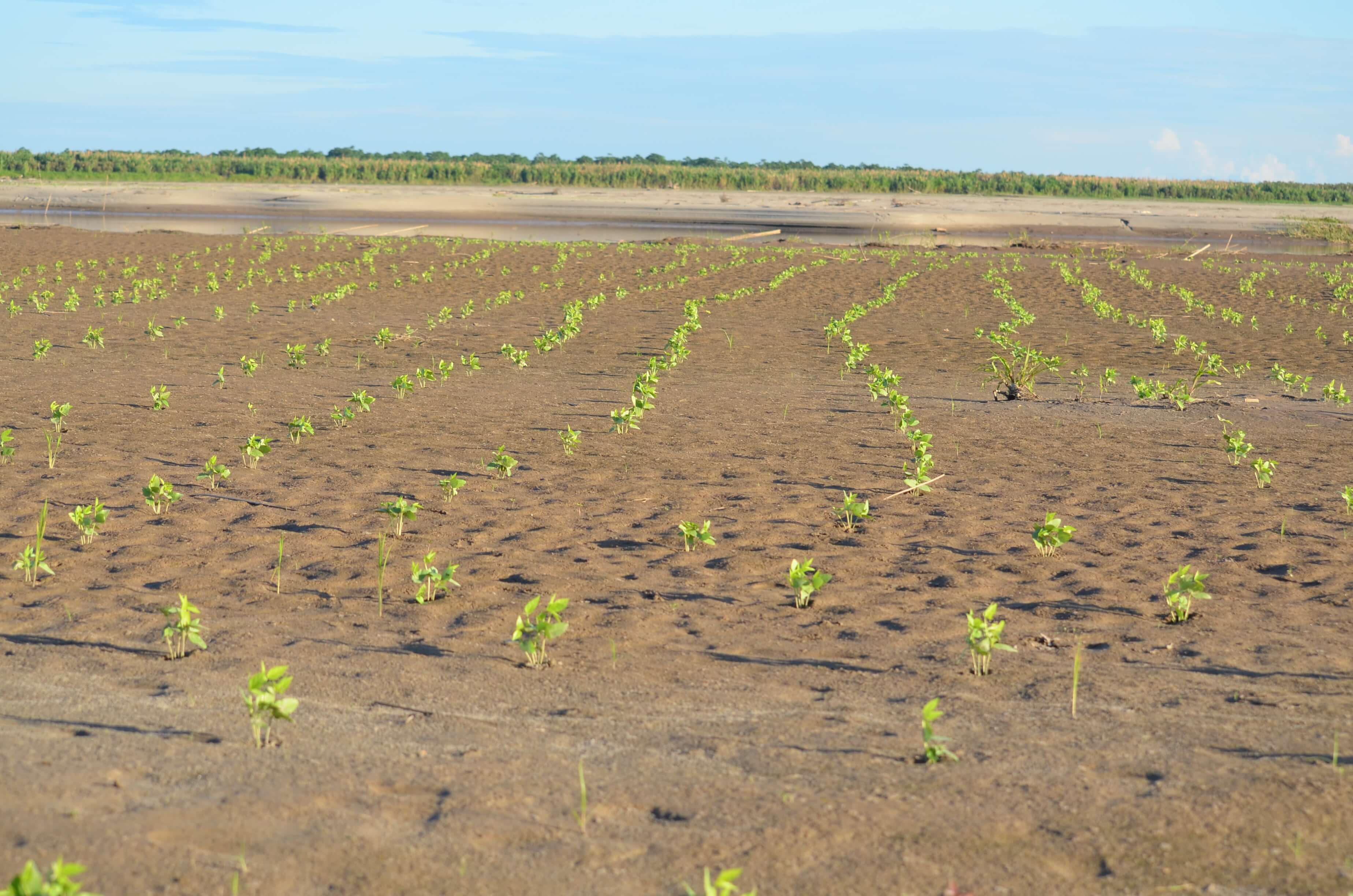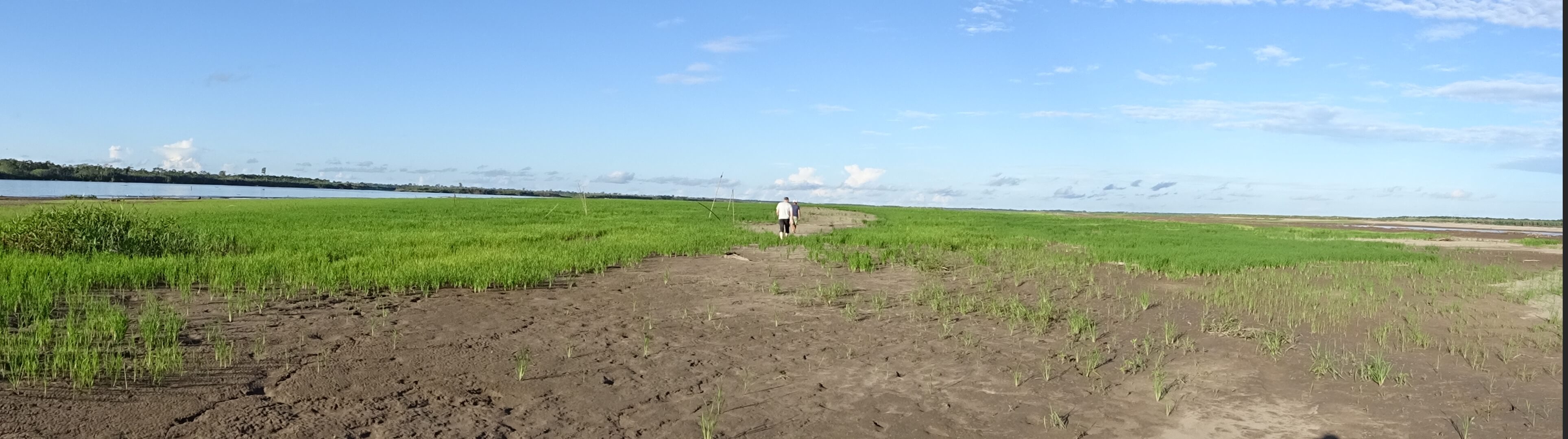 Climate change models predict higher and longer floods in western Amazonia (Sorribas et al. 2016; Ronchail et al. 2018) and with settlements concentrated along rivers, people in the Peruvian Amazon are likely to be among the first and hardest hit. How will they fare? Severe floods have been reported to occur every 3-to-6 years near Pucallpa (Langill and Abizaid 2020) and 2011 and 2014 were record-height floods (Figure 14); the risk of repiquetes affecting rice grown on mudflats is very high (60-70%), with average loss of 40% of the crop (List and Coomes 2017). A significant repiquete occurred just days before our trip (a 2.65 m spike in 48 hours; the typical annual flood amplitude is about 10 m) (DRAU, 2018). We stopped at a large mudflat planted with rice at Las Brisas, a left-bank community about 1.5 hours upstream from Contamana. The rice in the higher areas was amongst the lushest we have ever seen, but it was evident that the lower sections, closer to the river, had been severely damaged (Figure 15). A local farmer contemplating his loss said he was unsure if he would replant rice, or grow cowpeas instead, but he knew he had to plant again soon if he was to harvest before the next flood. Time will tell if mudflat rice will continue to be viable in the future.