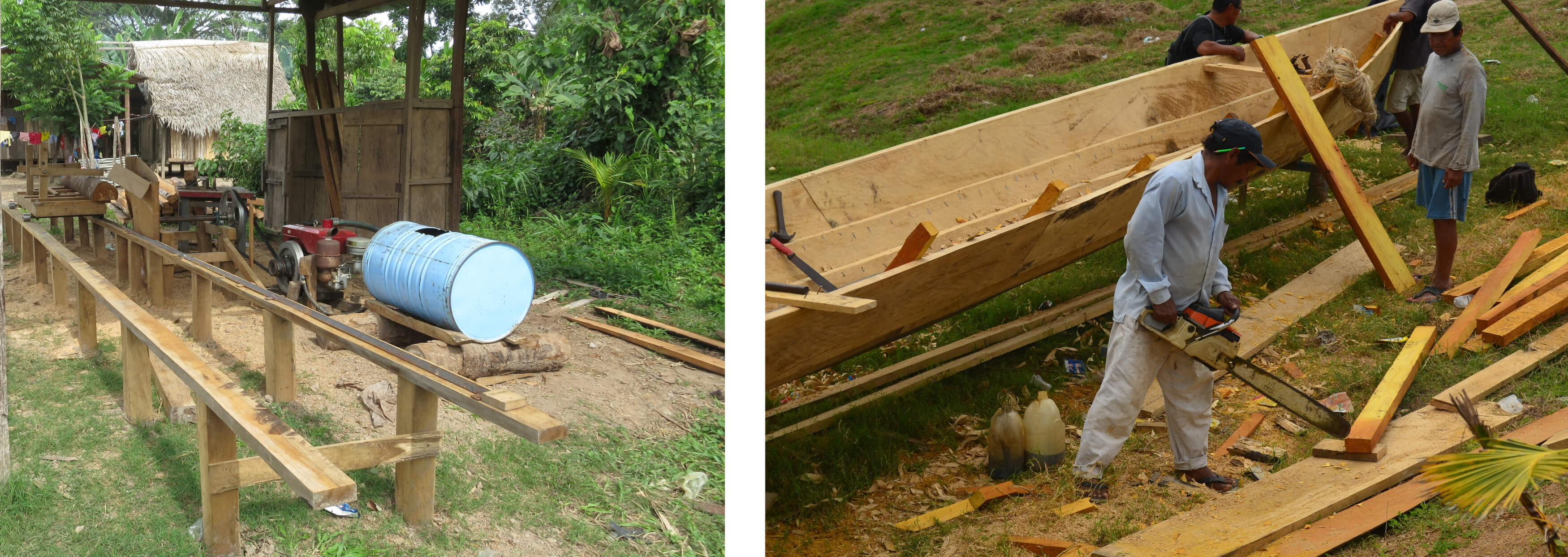 More broadly, small motors are creating new economic opportunities for rural peoples, allowing them to add value locally, provide new services, and run different types of businesses. We saw, for instance, a portable sawmill in Nuevo Canchahuaya and a group of men using a chainsaw to build a boat in Alto Perillo (Figure 22). We consistently encountered motokars, furgones and Kubotas transporting people or cargo in and around communities. In Victoria there were two sewing shops where women were making school uniforms and soccer jerseys of the Peruvian National team as part of the World Cup craze, using textiles brought in from Lima. Clearly, this diversification has the potential to exacerbate inequalities and social differentiation. However, the affordability of the smaller motors, especially peque-peques, also lowers entry barriers for participation in some activities. For instance, with a small peque-peque anyone can run a boat taxi (llevo-llevo) (Langill 2020), and in combination with an old fridge and ice, fishermen can preserve their fish longer and take their catch directly to market for sale (Figure 20) (Poissant 2021).