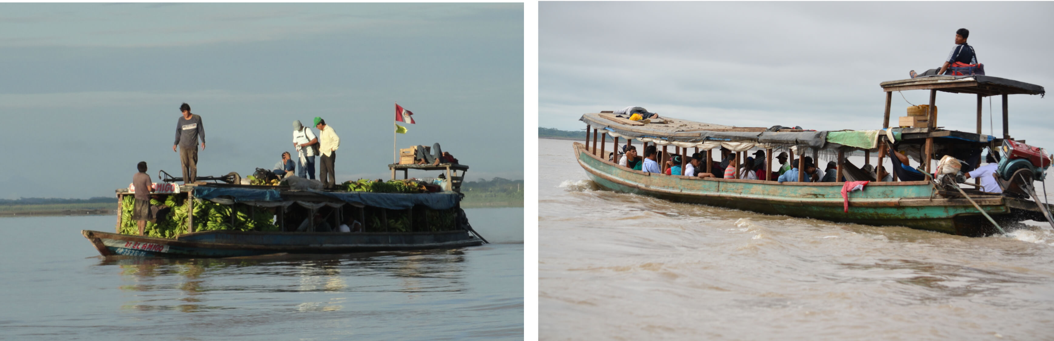 Amazonian rivers have always functioned as natural highways. People have used canoes and rafts since prehistory (Lathrap 1973) but by the mid-19th century, steamships began to transit up and down the Amazon. By the 1950s, diesel engine boats displaced the steamers. Today, a full gamut of watercraft navigates the Ucayali (Salonen et al. 2012). Canoes are still used for local travel in some places and the occasional raft can be seen drifting downriver with logs, durable goods, or live fish (Figure 4). Large lanchas offer regular passenger and cargo service between Pucallpa and Iquitos, stopping in selected towns and communities along the way, many of which function as intermediary hubs between the cities and other rural communities (Figure 5). Smaller boats privately-operated as river buses (colectivos) are more common within a day's travel from the cities; they stop anywhere en route upon request (Figure 6).